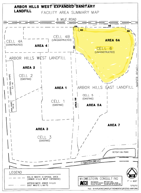 If you have driven by Six Mile and Napier Roads over the past year you probably noticed construction activity at the landfill. Arbor Hills has constructed what is referred to as Cell 6. It is the next area where Arbor Hills will be burying refuse and it is much closer to Northville Township neighborhoods.