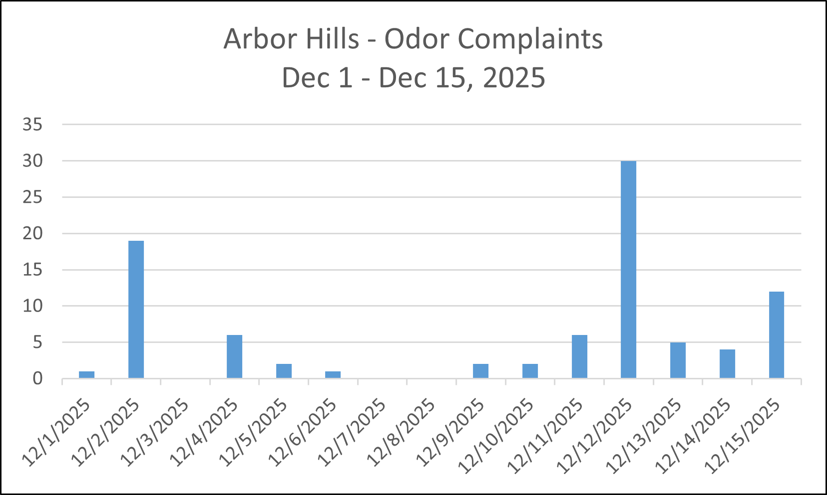 90 Odor Complaints were received during the first 15 days of December. The complaints were immediately forwarded to the landfill, EGLE, and several community leaders. EGLE conducted at least two odor surveillance sessions. EGLE observed community odors but did not feel they warranted a violation. The odor severity likely decreased by the time EGLE arrived.