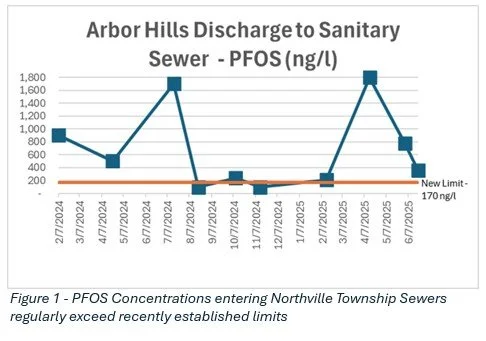 Recently, we learned that the Arbor Hills Landfill is struggling to comply with PFOS discharge limits in its leachate, which enters Northville Township’s sewer system and is transported—up to 100,000 gallons daily—to the YCUA treatment facility in Ypsilanti. YCUA’s plant is not equipped to remove PFOS; it controls PFOS in its discharge by setting strict limits for its industrial users. Arbor Hills received a new permit in September 2025, limiting PFOS to 170 ng/l. Industries expected the new limits. Green for Life installed a treatment system to remove PFOS and other PFAS[1] chemicals from the leachate; however, the system appears to be designed only to meet minimal removal standards.