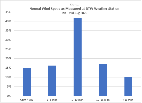 Chart 1 shows the normal distribution of wind speeds as measured at the DTW weather station. The dataset used was approximately 2 readings per hour from January 1, 2020, through August 21, 2020 (over 9,700 data points).