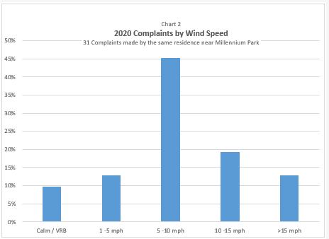 Chart 2 shows the distribution of wind speeds as measured during the 31 odor complaints made a family more than 3 miles away from the landfill in a Northville subdivision near Northville High School. The distributions are almost identical which indicates wind speed has little or no impact on the probability for an odor in this subdivision. Odors may be present at any wind speed.