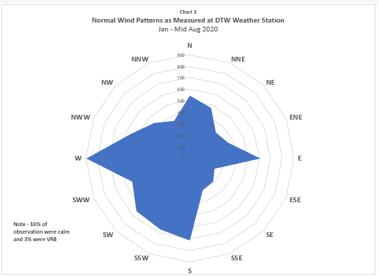 TCI downloaded the Local Climatological Data (LCD) for the Detroit Metro Airport (DTW) weather station from the NOAA website. The date and time recorded on odor complaint records were matched to the NOAA DTW Climatological Data to determine the wind speed and direction at the time of the odor complaint. Normal wind patterns were compared to the wind patterns measured at the time of odor complaints recorded by a single conscientious family located over 3 miles from the landfill in a subdivision near Northville High School (6 Mile Road between Beck and Sheldon Road). This document presents a description of the analysis performed and the conclusions made by this investigation.