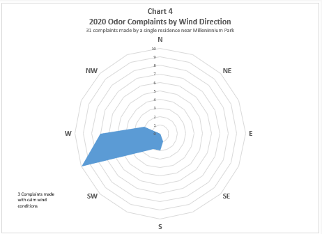 Chart 4 is a radar chart showing the wind directions for the 31 odor complaints made by a family more than 3 miles away from the landfill in a subdivision near Northville High School. It should be of little surprise as the landfill is located to the WSW of the Subdivision. What may be surprising is the subdivision is 3 miles from the landfill.