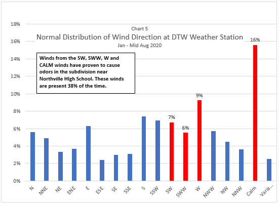Chart 5 is another depiction of the normal wind direction as measured at DTW. In this chart, we have highlighted the bars with wind directions which have resulted in odors in the Subdivision near Northville High School. Based on normal wind distribution patterns, approximately 38% of the time the wind direction has the potential for odors in the subdivision near Northville High School.