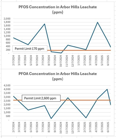 Figure 1 - PFOS and PFOA concentrations and permit limits in the Arbor Hills Landfill’s leachate discharge to the sanitary sewer