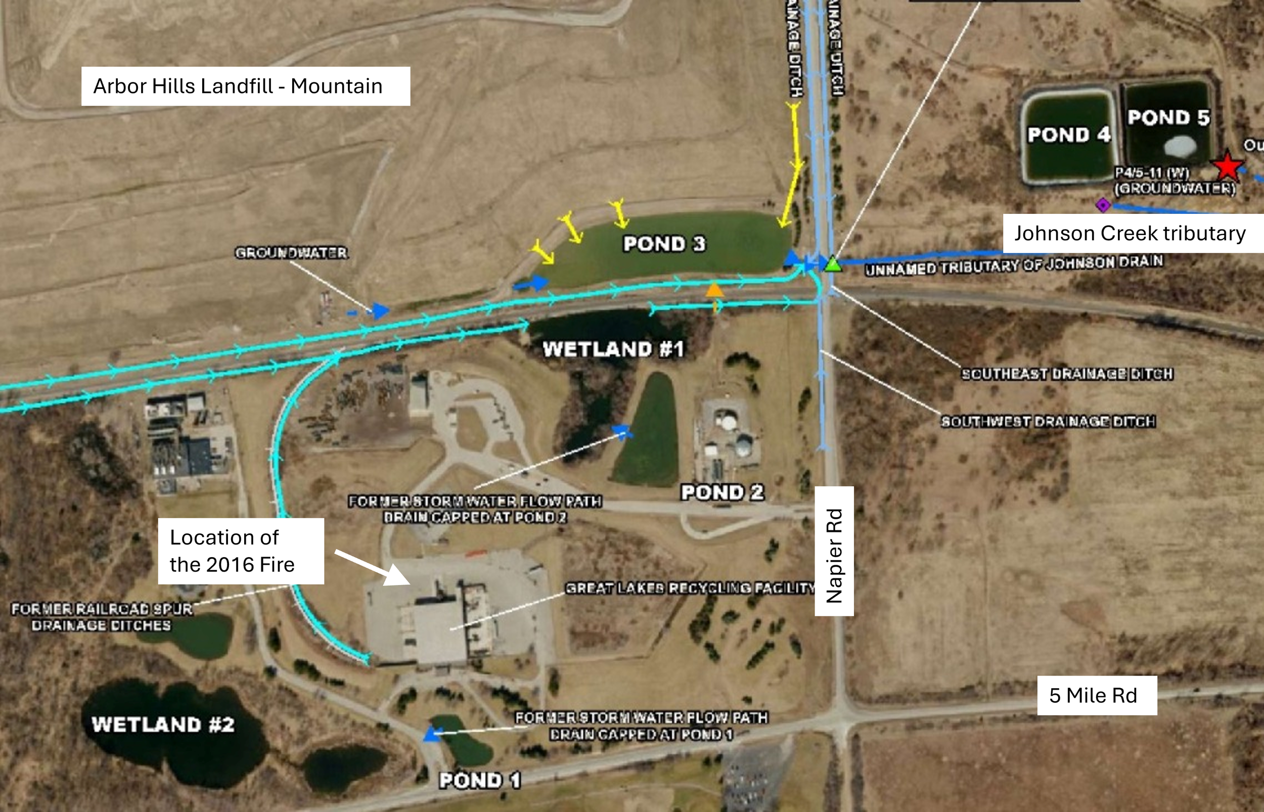 TCI Commentary: GLF has cleaned at least two stormwater ponds on site, but only after the PFAS and sediment-entrainment issues were highlighted to the public and reported to EGLE and the Washtenaw County Drain Commissioners' office.[3] It is unclear whether EGLE provided oversight and verified the adequacy of remediation for the large stormwater detention pond (pond 3). It is doubtful that GFL would have completed the pond cleaning without the public scrutiny.