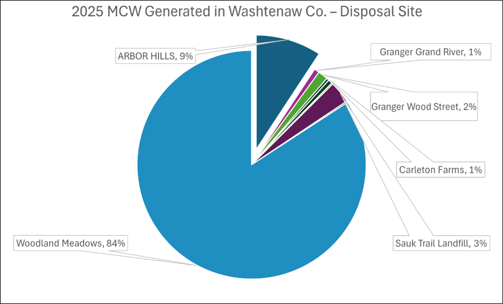 MCW is the waste regularly collected from our homes and businesses and relies on readily available landfill space for disposal. Less than 10% of Washtenaw County's MCW relies on Arbor Hills. More than 80% of Washtenaw County's MCW is shipped to the Woodland Meadows landfill in Wayne County. Woodland Meadows has permitted capacity for the next 20+ years.