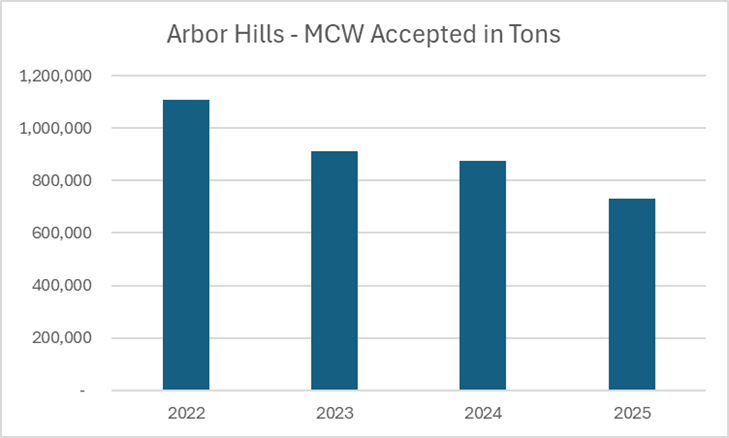 MCW represented the most significant type of waste at Arbor Hills in FY2025. MCW contains high levels of organic material. Reducing MCW should help reduce nuisance odors. The amount of MCW accepted at Arbor Hills has decreased by more than 30% since 2022. It is unclear whether this is due to Market Conditions (i.e., there is a less expensive alternative to Arbor Hills) or a deliberate effort not to fill the landfill too quickly.