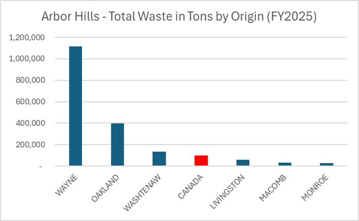 Oakland and Wayne Counties are responsible for approximately 75% of the MCW shipped to Arbor Hills. In FY2025, Arbor Hills accepted more MCW from Canada than it did from Washtenaw County.